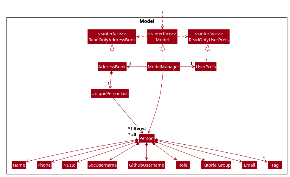 Personobjects (e.g., results of a search query) as a separate filtered list which is exposed to outsiders as an unmodifiableObservableList<Person>that can be ‘observed’ e.g. the UI can be bound to this list so that the UI automatically updates when the data in the list change. - stores a